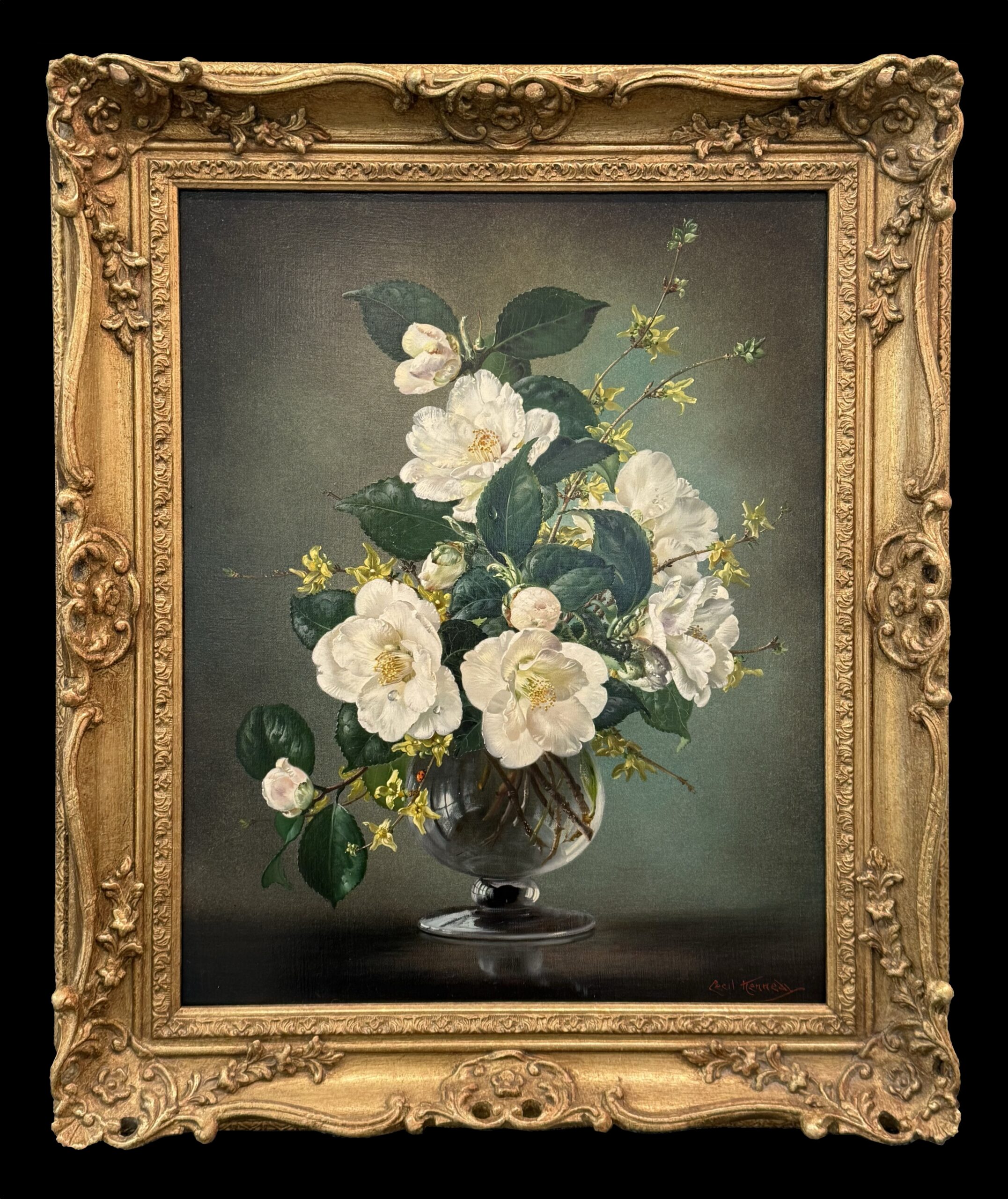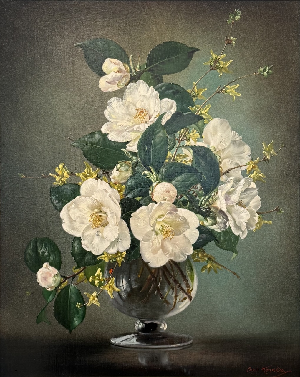 Born in Leyton, England Cecil Kennedy is best remembered for his minutely detailed depictions of flowers, additionally he also worked as a portraitist. His greatest works are admired for their exquisite detail and artful compositions, and many of these were produced during the 1960’s. His wife Winifred created the brilliant flower arrangements, usually in a vase from their collection of mid-eighteenth century Waterford vases, which further inspired his work.