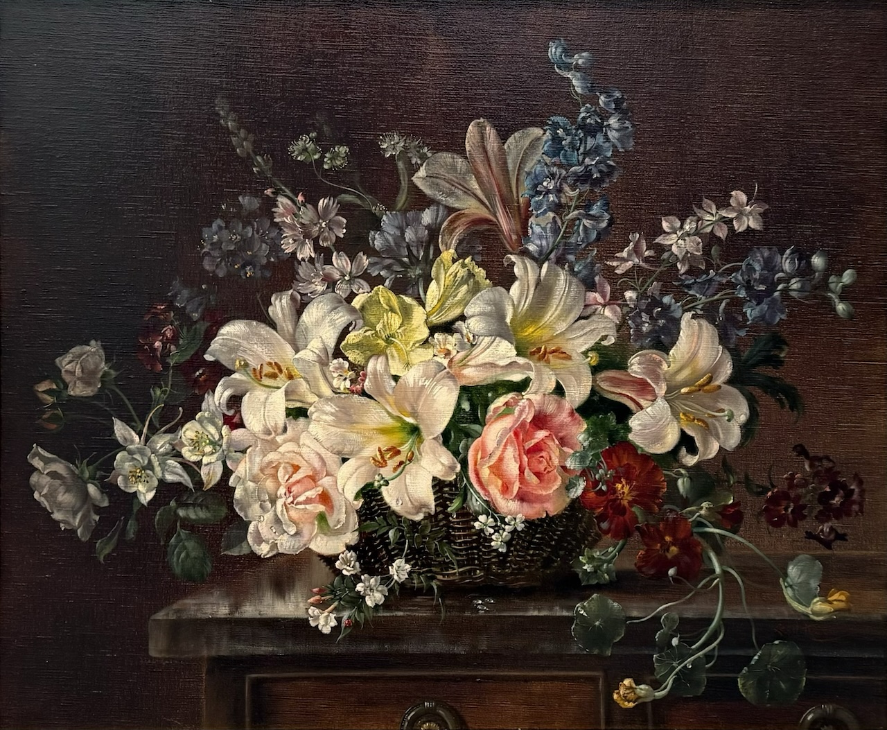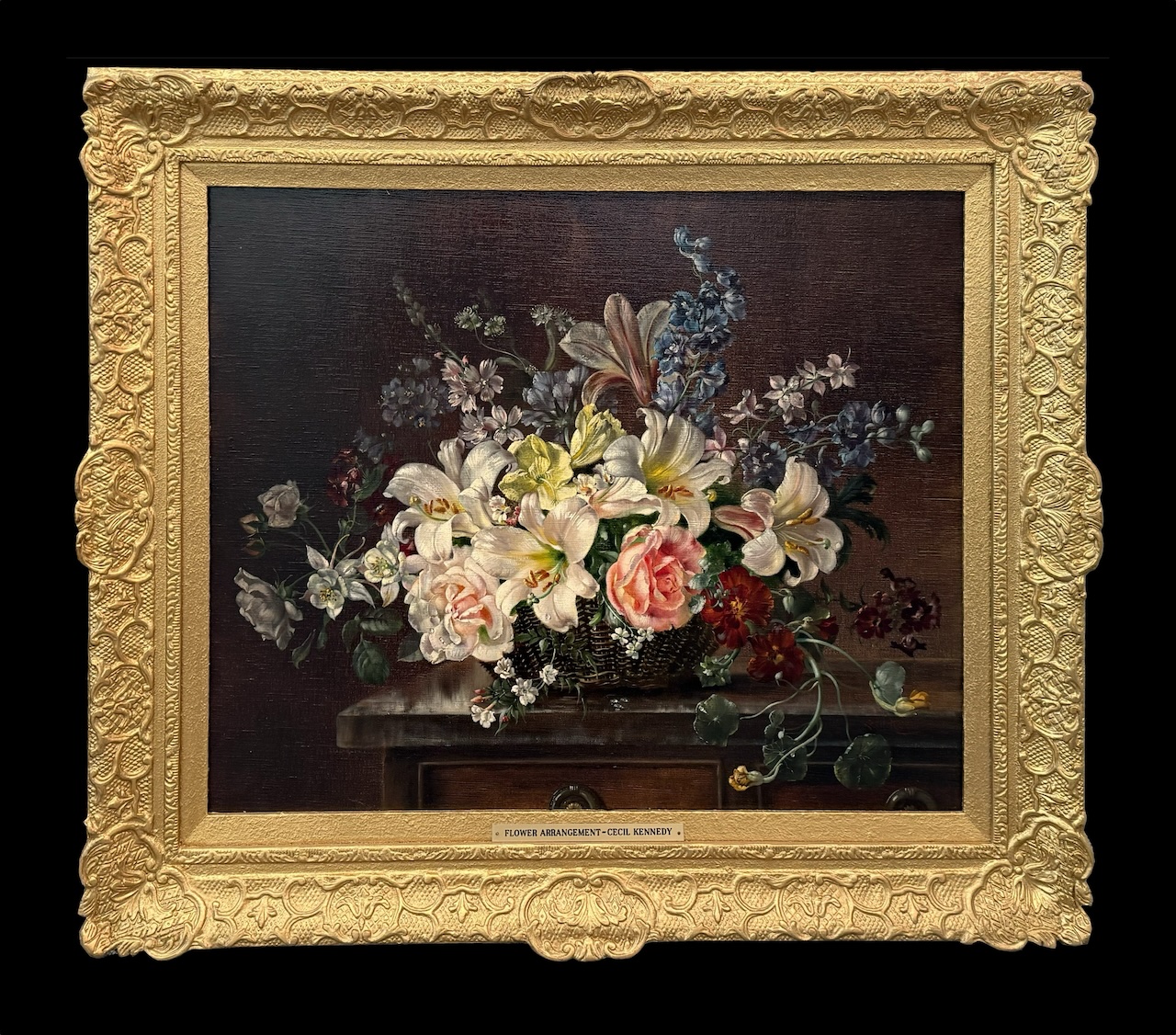 Born in Leyton, England Cecil Kennedy is best remembered for his minutely detailed depictions of flowers, additionally he also worked as a portraitist. His greatest works are admired for their exquisite detail and artful compositions, and many of these were produced during the 1960’s. His wife Winifred created the brilliant flower arrangements, usually in a vase from their collection of mid-eighteenth century Waterford vases, which further inspired his work.