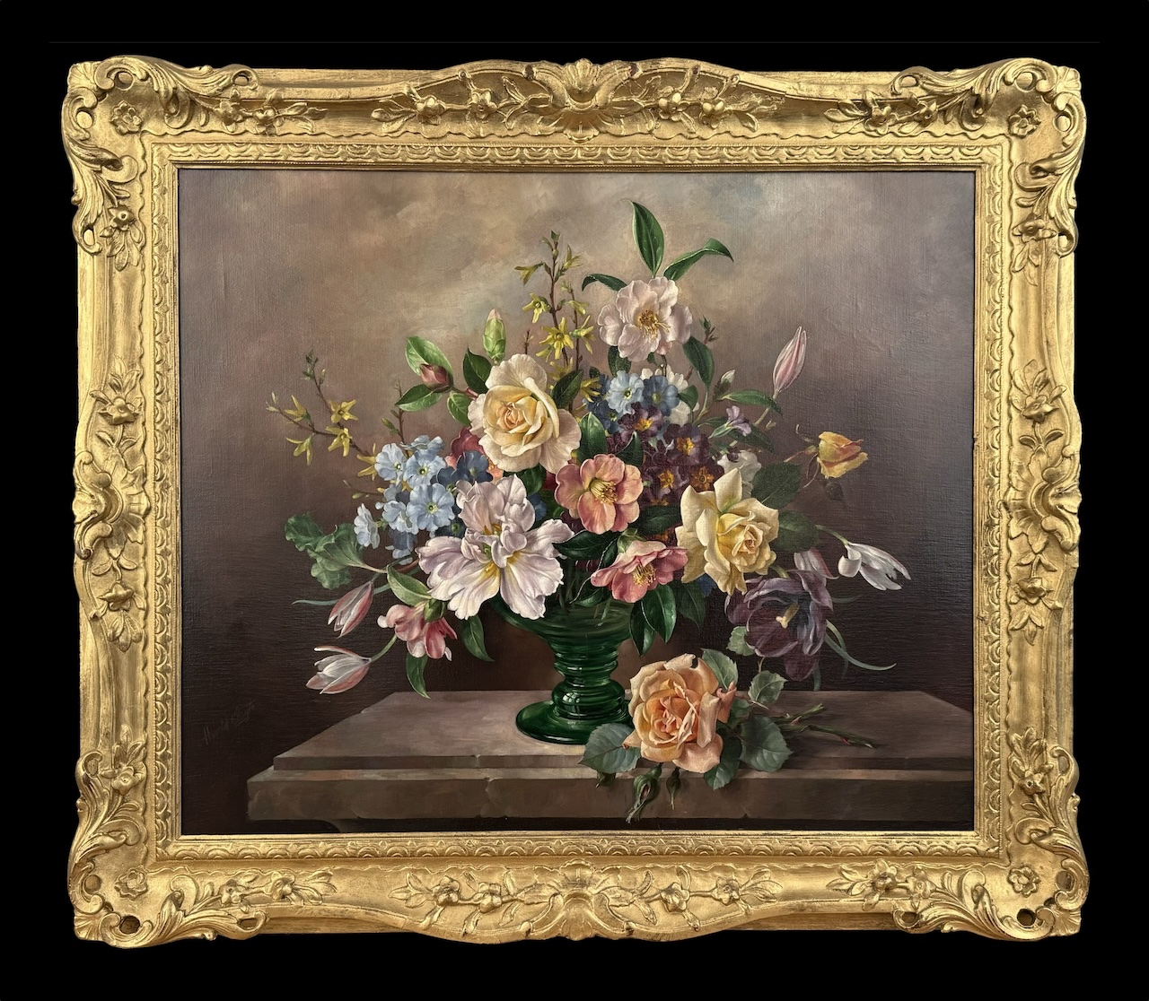 The presented piece is particularly charming. A brilliant example of Clayton’s oeuvre, depicting a crowded display of an abundant bouquet of flowers in a white and blue vase, with gold detailing cascading across the delicate material. A rich gold lion peeking through the petals creating a bold and striking detail to this lavish vase. Claytons approach compels a sense of sensitivity. His brushstrokes confidently evoking the delicate nature of the flowers and foliage. Clayton has a recognisable vibrant colour palette. This conscious decision to use vibrant colours emphasises the rich bounty and beauty of the flowers. An abundant bouquet against an especially plain slightly one tonal background pushes the grand detail to the foreground.