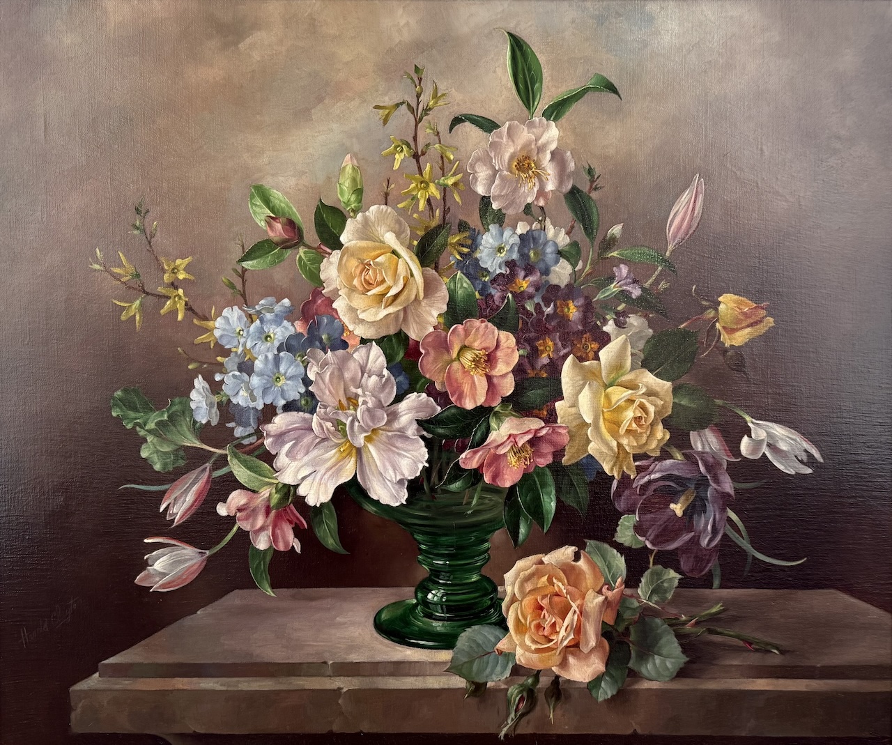 Harold Clayton was a British painter best known for his extravagant depictions of floral arrangements in delicate ornate vases usually decorated with gold detailing. Although these art works were painted in the 20th century, Clayton painted with immense detail. These detailed techniques and centred compositions reminisce the aesthetic of 16th-century Dutch still-lifes.