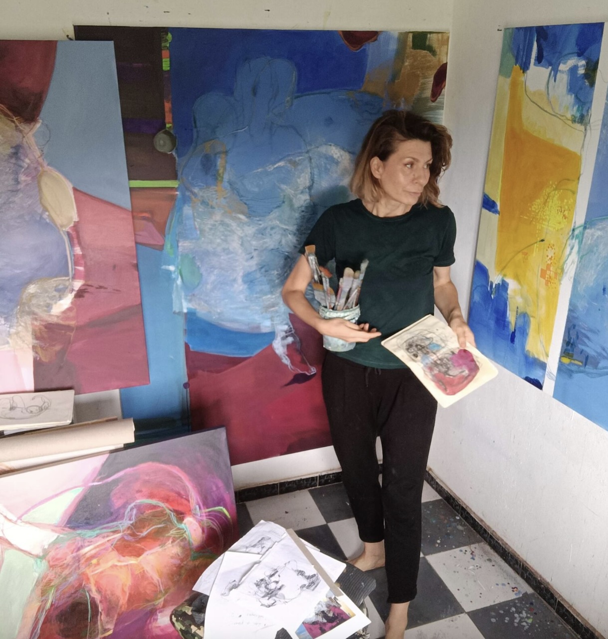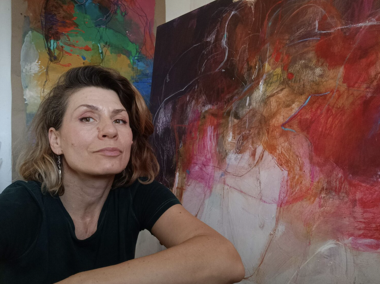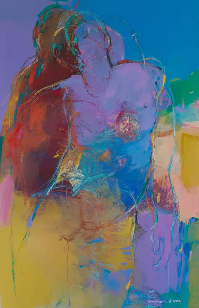 Having grown up close to nature, she finds parallels between organic movement and the human body. Her use of lines evokes threads and fibres, veins and roots that express inner life, memory and a sense of connection. Through strong colour, fluid lines and layered textures, her work reveals how movement transforms the body into a landscape of emotion and energy.