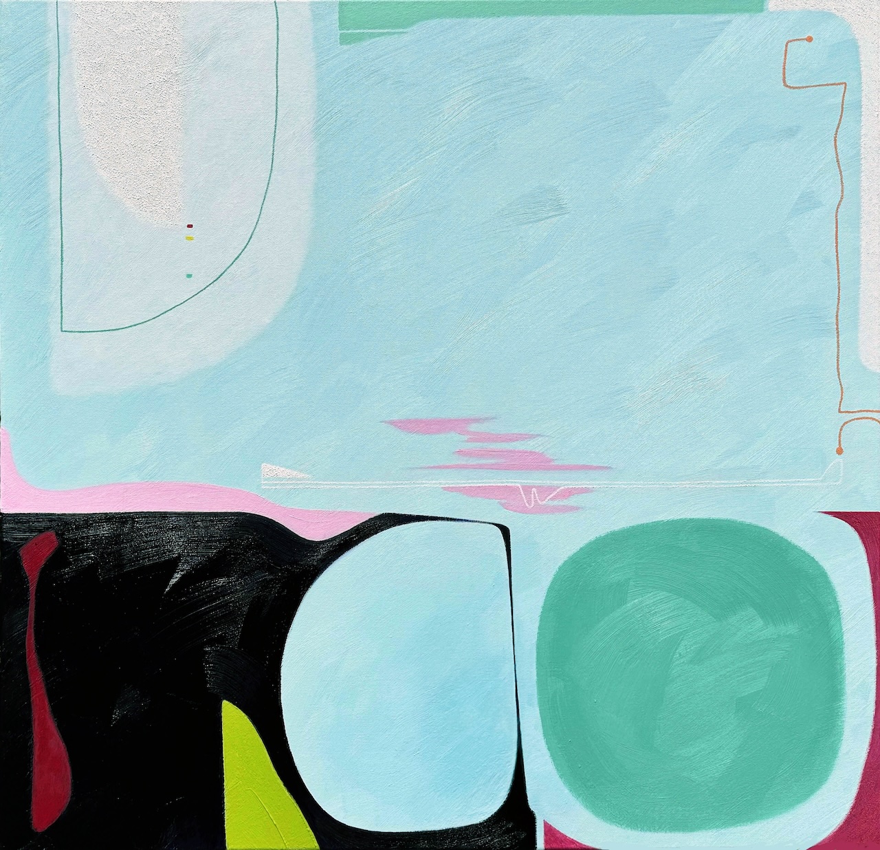 The vibrant almost neon colours reflect the vibrancy he sees in the world. The use of saturated colours are distinctive within Jones work. The expansive colours take on abstract shapes in which consume the composition but within these are small jewel-like accents of bright glimmering ultramarine, umber, violet or viridian creating deep sumptuous chromatic blacks on the canvas.